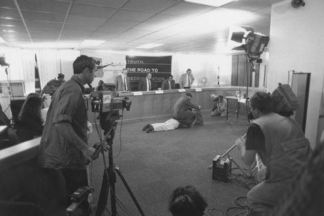 George Hallet, Jeffrey Benzien demonstrating the wet bag method of torture at a hearing of the Truth and Reconciliation Commission, Cape Town, 1997.