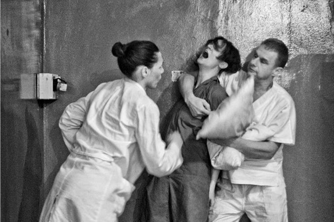 Il dentro si capovolge nel davanti al secondo atto di questo documentario vivente, presepe tragico e criminale di natività lasciate al freddo e al gelo dei propri fantasmi. I matti adesso sono tutti nel corridoio, suddivisi fra un televisore, un tavolo, una panchina, un letto, degli armadietti. In mezzo sta lo sportello dell’accettazione, la portineria, ai lati i momenti del lavarsi, del mangiare, del dormire, dello stare in giardino. Si sfoglia un giornale sbiadito, un numero di “Oggi” degli anni ’50-’60. Il dottore passa e si ferma solo per farsi strapazzare il camice dall’infermiera. La vita degli altri scorre, quella degli internati è una crisi continua, punteggiata di pochi sorrisi, che rendono il gelo ancora più pungente. E quando anche le parole vengono meno, ci pensa la televisione, le soap opera, una agorà refugium peccatorum, una giostra di anestetiche luci colorate che riesce a riappacificare con gli ospiti nella testa, eccetto quelli che hanno bisogno di essere legati nudi alla rete del letto per ritrovare a forza un’incostante tranquillità.
