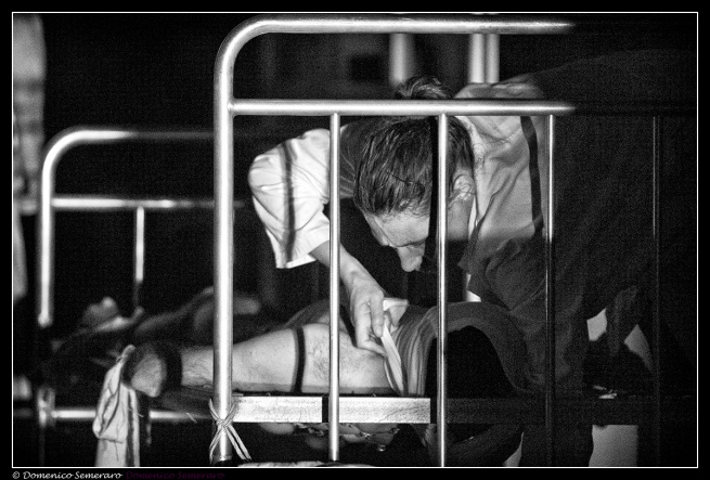 Echi di chiavi suscitano una luce fioca, smunta, su un corridoio stretto, tre porte sorvegliate da due infermieri e poco dopo da un’assistente sociale, barlume di solidarietà, tolleranza e comprensione nella notte dei lunghi lamenti. Forse la personificazione stessa dell’empatia, della partecipazione dell’azione teatrale alla natura del manicomio. I matti sono ancora incorporei, presenze assenti, ossessioni uditive: i contenuti in cella e i contenuti delle celle. Ascoltiamo Mombello con gli occhi bassi, colpevoli, come per vergogna del destino che ci ha messo da questa parte delle porte: la compresenza reale nel medesimo luogo e lo scontro tra la scelta nostra (volontaria) di essere qui e la detenzione altrui (involontaria) è la chiave di una partecipazione emotiva che è diversa dall’immedesimazione catartica, è la presa di coscienza di un alfabeto di richieste di aiuto che non abbiamo saputo riconoscere prima e al cui annientamento ora assistiamo immobili e impotenti.
