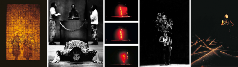 Cinque esempi di fotografie di scena del Teatro delle Albe, tratti ciascuno da un differente opus di Cellula, foto di E. Fedrigoli, M. Buscarino, M. Caselli Nirmal.