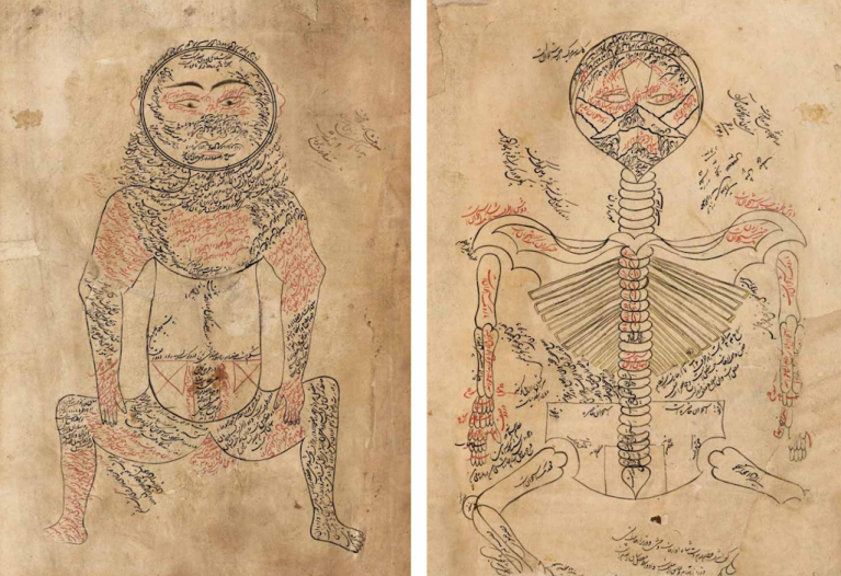 Le due raffigurazioni dello scheletro umano tratte dal Canone di Medicina di Avicenna, che aprono e chiudono Cellula.
