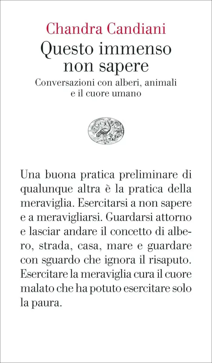 Questo immenso non sapere riprende la prosa frammentaria – ricordi, pensieri, riflessioni e scene – che già Chandra Candiani ci aveva fatto incontrare con Il silenzio è cosa viva. È popolato di animali e alberi, come se avesse chiamato a raccolta, per presentarceli, gli “abitanti della meraviglia” che abbiamo imparato, nei versi, ad ascoltare, riconoscere, seguire; a non guardarli troppo negli occhi e a non provare a capirli. Animali che salvano e che ammazzano. E poi l’erba, i fiori del melo, il ciliegio selvatico, le leggi di inquietudine. C’è il virus, la trasformazione, lo spavento, il sospetto che tanto ci accompagna davanti agli altri. La morte, il male inflitto, il male ricevuto: il male che resta male, anche se può passare da insoffribile a soffribile. Ed è già qualcosa, lo si può dire. Il mondo è anche un inferno, l’oscuro è nelle cose e ci sono ferite dai segni indelebili. Sono grata a Chandra Candiani perché non ci invita a pensare che si possa sempre essere intonati al mondo. No, delle volte si è stonati, delle volte si è sordi. Così l’arte della meditazione diventa una pratica che si accompagna al camminare e al mangiare, gesto di vita quotidiana: non arte di allontanamento dalla vita, di padroneggiamento, ma piuttosto resa, “grazia di abbandono”, immersione radicale nell’esserci degli avvenimenti, nelle storture, nelle rabbie e nelle stagioni. Chandra Candiani mostra come la compassione non sia postura di santità, ma esercizio costante di riposizionamento, di dissolvimento dell’io, di ricerca di radici impersonali e comuni.