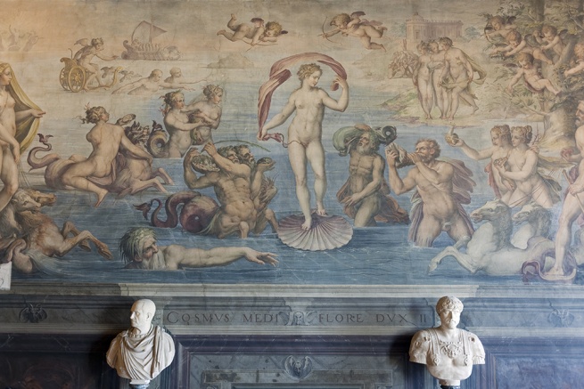 This morning, during a short break at the museum, I went on a stroll through the Room of the Elements, looking at Vasari’s Allegory of Water. The handling of the planes is godawful, you have to admit. Almost nobody gives a crap about the birth of Venus. Everyone seems to have showed up for the wrong scene, five minutes late, out of breath. Or they’re like fishermen waiting for their bite and gazing every which way, albeit hopefully. Neptune has lost his horses, the tritons are bearing weird, inappropriate gifts. Allegorical snafus.