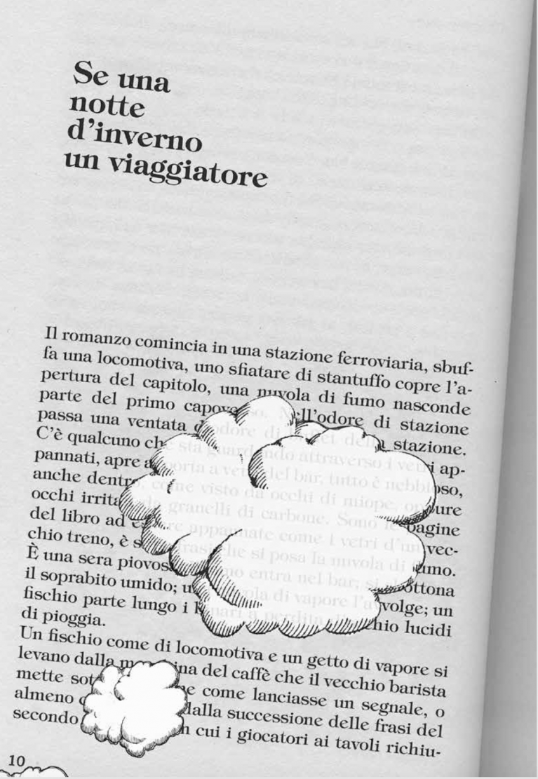 Il primo incipit di Se una notte d’inverno un viaggiatore di Italo Calvino è ambientato in una stazione ferroviaria, sbuffa una locomotiva, «uno sfiatare di stantuffo» copre l’apertura del capitolo, «una nuvola di fumo nasconde parte del primo capoverso», vetri appannati, nebbia fuori e dentro il buffet della stazione, «sono le pagine del libro ad essere appannate come i vetri d’un vecchio treno, è sulle frasi che si posa la nuvola di fumo» (Einaudi, Torino 1979, p. 11). Mendelsund lo interpreta letteralmente e disegna delle nuvolette sulla pagina del libro: non è un semplice gioco, non è l’interpretazione superficiale dello scritto, ma l’individuazione del tema centrale dell’incipit, di tutti gli incipit di cui è composto questo testo, forse di tutti gli incipit dei libri.