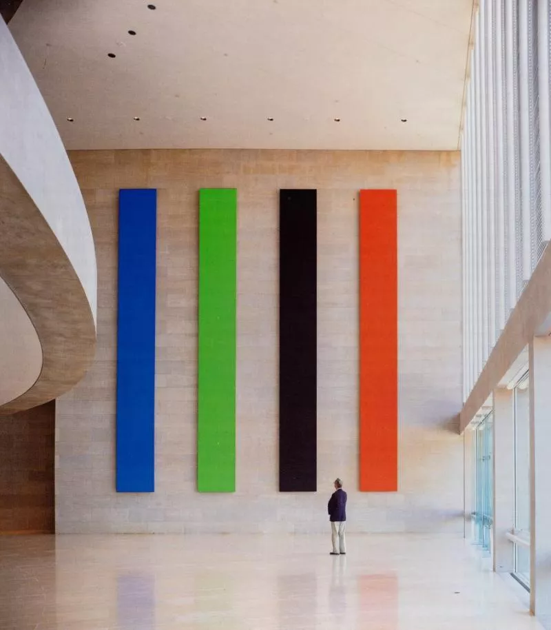 Allo stesso modo le opere di Andy Warhol in cui il prelievo e la decontestualizzazione degli oggetti, la loro messa in serie e gli ingrandimenti mettono in gioco il rapporto percettivo tra rappresentazione e presenza dello spettatore. Come sostiene nel suo contributo Maria Giuseppina Di Monte, “il formato gioca un ruolo nella ricezione delle opere ovvero nel modo in cui esse vengono vissute ed esperite”. Concentrandosi sul lavoro dell’artista americano Ellsworth Kelly – come nel caso di Blue Green Black Red: The Dallas Panels realizzata nel 1989 per il Morton Meyerson Symphony Center di Dallas (fig. 5), Red Floor Panel (1992) e White curve (2001) – viene fatta chiarezza sul rapporto fruizione-formato e sul rapporto che queste opere di grandi dimensioni intrattengono con lo spazio in cui sono collocate.