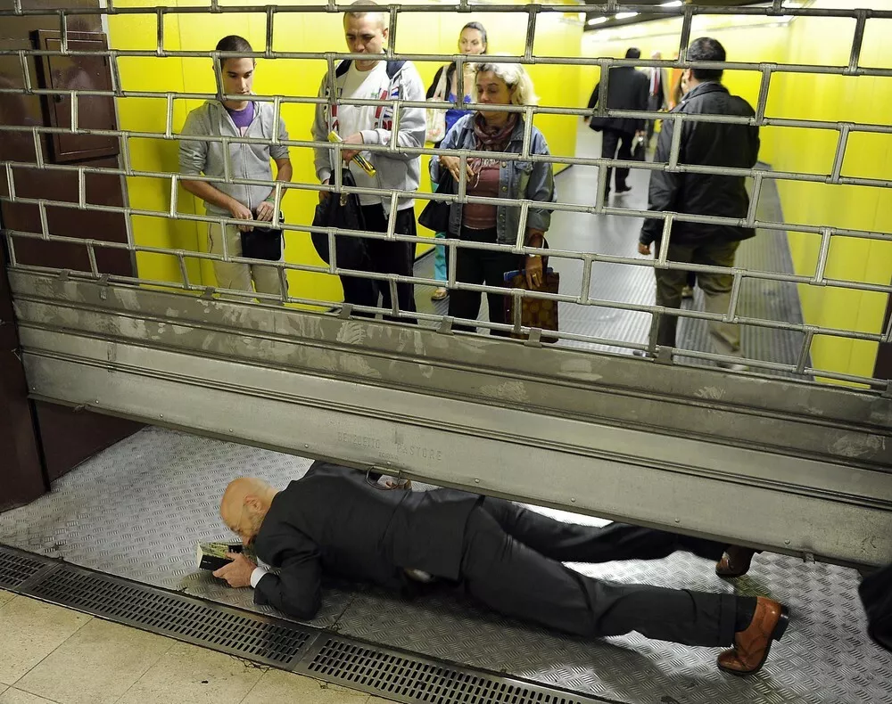 Ieri è stata una giornata infernale per chi usa i mezzi pubblici – milioni di persone in Italia ogni giorno –, a causa dello sciopero. Oggi sui giornali ci sono le foto di questa piccola apocalisse: uomini e donne che, ventre a terra, cercano di transitare sotto le saracinesche della metropolitana milanese nel tentativo di prendere l’ultimo treno di passaggio; in alcuni casi, pare che siano stati gli stessi passeggeri a rialzare di forza le serrande. Sul quotidiano “La Stampa”, la più emblematica di queste immagini: un signore ben vestito, stile manager, che striscia sotto il pertugio lasciato aperto dalla saracinesca della MM. Pare che qualcuno l’abbia anche identificato, così si cinguettava stamane su Twitter. Due cose tuttavia colpiscono: la testa rasata e, soprattutto, il libro che stringe con la mano sinistra (la destra, che non si vede, impugna forse una borsa). Un salvagente, un talismano, un oggetto d’affezione? Cosa significa quel libro? Ma soprattutto che libro è? A guardare bene sembra un libro economico. Lanciamo un piccolo concorso: chi indovina il titolo del libro avrà in regalo un ebook di Doppiozero, uno a scelta. Un omaggio a chi ama i libri di carta, e anche digitali.