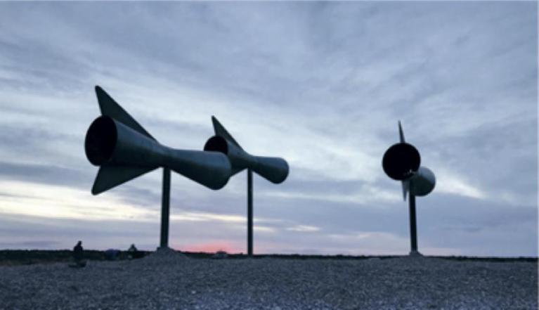 Le risposte sul segreto dei tempi delle nostre vite e di quello dell’universo si nascondono da qualche parte in queste opere, sepolte forse sotto la massa di abiti sgualciti, o dietro i teli leggermente sollevati da un ventilatore, che concedono pochi e fugaci sguardi sulla violenza, sulla morte (Les Concessions, 1996). O forse altrove, nel nord della Patagonia, dove Boltanski installa le sue trombe attraversate dal vento per stabilire una comunicazione con le balene (Misterios, 2017): la leggenda lì vuole che siano questi cetacei a custodire i segreti del principio dell’universo, e Boltanski ci permette di fare l’assurda esperienza di chiedere loro una risposta sul nostro destino, che fatalmente, l’avrete capito, non arriverà. L’opera mostra e ci fa sentire, su tre schermi attigui, le trombe che risuonano; una carcassa di una balena, che ha custodito con sé il segreto fino all’ultimo; e un vasto orizzonte marino, il vuoto del mancato responso. Queste grandi trombe non resisteranno al tempo, veniamo informati che esse saranno abbattute o portate via dal vento. O forse si disintegreranno, proprio come Ahasuerus, nel momento immaginario in cui riusciranno a captare l’agognata risposta.