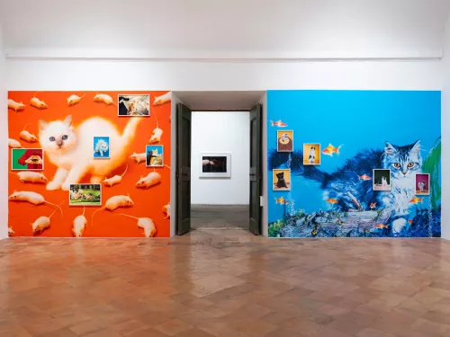 Colore colore colore: per una mostra in cui si rischia l’information overload, diversamente da come ci si aspetterebbe, la scelta curatoriale è di non informare. Niente cartellini sotto alle opere, “pannelli” di sala scarni e poco leggibili; anche il libro che accompagna la mostra è quasi privo di testi. Il visitatore è lasciato da solo davanti alle fotografie, l’immagine si prende tutto lo spazio, fisico e mentale, grandi wallpaper occupano intere pareti. L’intento è chiaro: l’allestimento riproduce in grande scala il format della rivista Toiletpaper – che diventa così il filo conduttore della mostra – ideato proprio da Cattelan e Pierpaolo Ferrari.