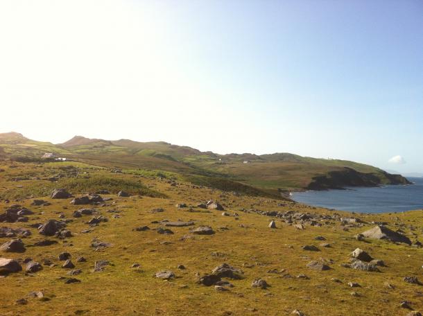 UMANI. “Uomini e pecore (pochi gli uomini)”, potremmo dire. Le pecore sono la comunità più numerosa. D’estate ci sono poco più di 200 persone, inclusi i turisti e i volontari o WWOOFers (da WWOOF, l’associazione internazionale di fattorie biologiche e biodinamiche). D’inverno ci sono circa 130-150 persone – tante quante in un grande condominio, ma qui c’è una densità di circa 8 km per abitante! Prima della carestia del 1845-48 erano però in 1600. Le tracce sono ancora visibili: le croci celtiche del cimitero attorno alla chiesa, le mura di pietra di case senza tetto, le dorsali di patate, nascoste dalla vegetazione ma affioranti come vene sottopelle alla luce del tramonto. Sono le vie dei canti di Clare Island.