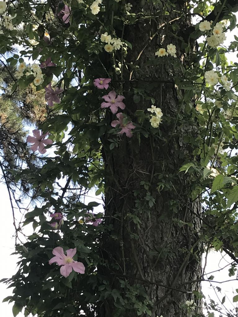 Si suol dire che le clematidi vogliano ombra al piede e sole in testa. Vero, almeno per quel che riguarda la propaggine inferiore; ma vi sono ibridi come la Comtesse de Bouchaud dal grande fiore rosa, che vegetano sotto l’ombrello degli alberi e vi si arrampicano con piacere reciproco.