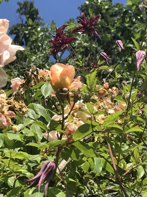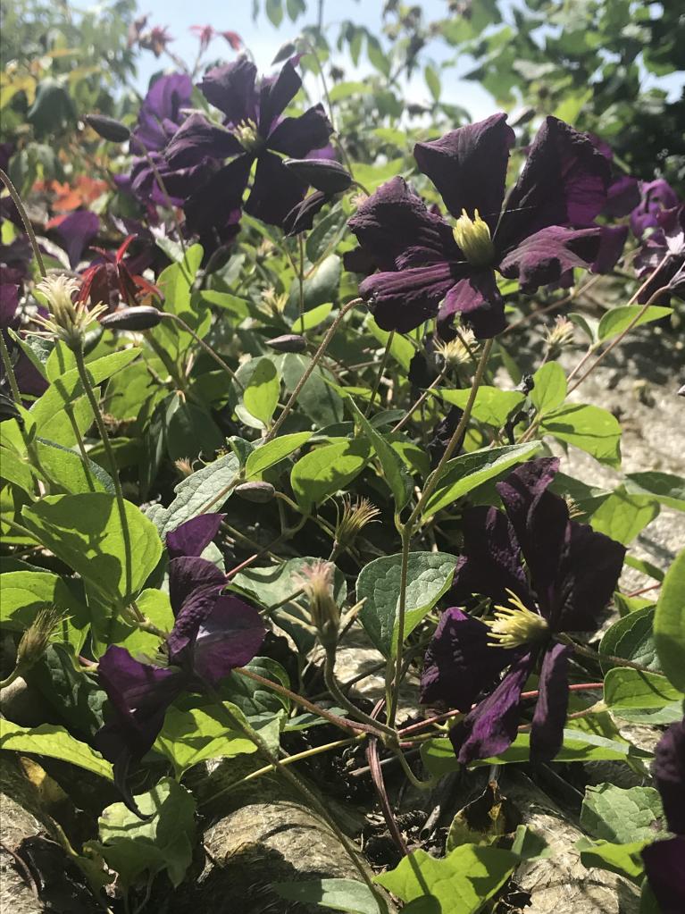 Molti si lascian conquistare dalle corolle stradoppie. Benché prediliga la semplicità del giro a quattro o a cinque sepali, come nella C. Jackmanii o nella Etoile Violette – maliarde nel loro viola profondo –, non disdegno il vecchio ibrido di C. viticella Purpurea Plena elegans, un trionfo di coccarde porpora, splendide su un pergolato abbinate al giallo uovo di una rosa Goldfinch.
