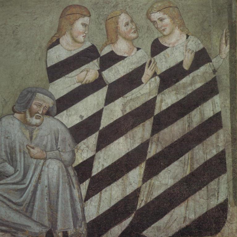 Per i dipinti della chiesa dei Domenicani di Bolzano, che ho visto e rivisto, volevo rifarmi all’apertura del libro di Pastoureau La stoffa del Diavolo, che dimostra di non aver visto il dipinto. Le tre figlie di un padre disperato sono vestite a strisce oblique bianche e nere per essere avviate alla prostituzione, se non fosse per l’intervento di San Niccolò che dona loro a ciascuna una mela d’oro… Per me quindi non si tratta dell’abito del diavolo – che è verde e poi rosso –, ma d’infamia oppure di lascivia. Nel medesimo affresco le strisce appartengono ai suonatori di viella (musica profana), posti più in basso rispetto agli angeli che suonano la musica sacra.