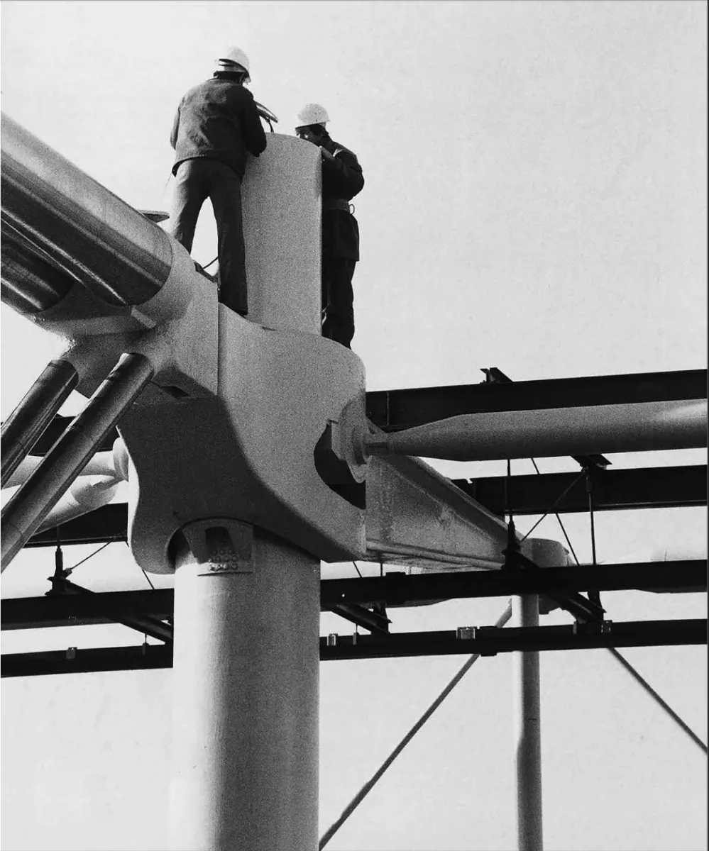 In copertina, Piano+Rogers Architects e Ove Arup & Partners, Centre Pompidou, operai al lavoro sulla Gerberette per l’installazione delle pompe del sistema di riempimento ad acqua trattata, 1976.