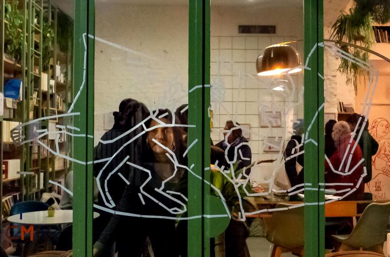 A ben vedere anche nei cartoncini delle Lectures i piani sono molteplici: stampa-disegno, ricamo-scrittura. Per non parlare della vetrina del Walden Cafè: osserviamo l’interno del locale – l’arredamento, le persone, i libri, le opere esposte, la vita che ospita – proprio attraverso la sua vetrina, sulla quale un personaggio, tratteggiato con il nastro adesivo, legge abbracciato al suo cane.