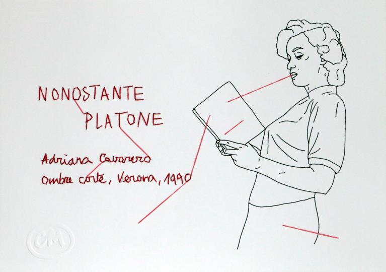 Torniamo quindi al progetto per Walden: i titoli scelti e ricamati sui cartoncini riguardano letture significative per l’artista, riguardanti l’ambiente, l’ecologia, l’economia, la filosofia politica, il rapporto uomo-animale, le questioni di genere e il femminismo. Vediamo ad esempio che una ragazzina con il velo è concentrata nella lettura del già citato Orientalismo di Said (1978), mentre la pittrice rinascimentale italiana di nobile rango Sofonisba Anguissola (tratta da un suo autoritratto) legge L'usage du Monde di Nicolas Bouvier (1963); un giovane ragazzo (da una foto trovata, risalente al 1940, scattata a Londra durante i bombardamenti) è alle prese con Histoire de la Folie di Michel Foucault (1961), invece il figlio dell’artista Aliseo con la sua amica Olivia affrontano When God Was a Woman di Merlin Stone (1976). Non mancano i fondamentali L’ordine simbolico della madre di Luisa Muraro (1991), in mano ad un uomo che dà il biberon a un neonato, e Nonostante Platone di Adriana Cavarero (1990), assegnato a Marilyn Monroe.