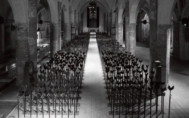 Decine di attrezzi contadini terminanti con un arcigno uncino, messi tutti in direzione identica e leggermente inclinati per dare un movimento meraviglioso a ciascuno e sinfonico a tutti, ed ecco un gruppo di fenicotteri danzanti all’unisono in chissà quale laguna di Provenza, in chissà quale pianura fangosa del Brasile.