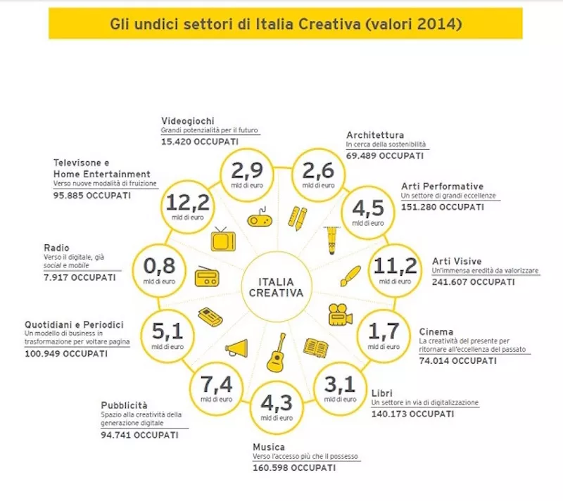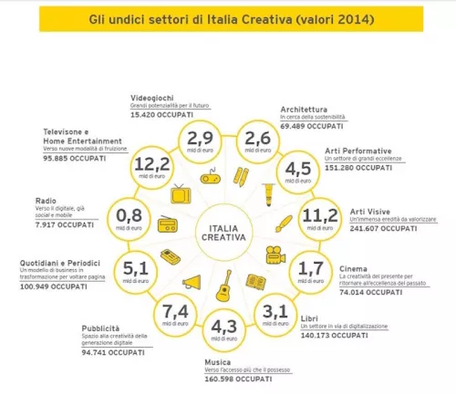 Le imprese del sistema produttivo culturale (da sole, senza considerare i posti di lavoro attivati negli altri segmenti della nostra economia) danno lavoro a 1,4 milioni di persone, il 5,8% del totale degli occupati in Italia, che salgono a 1,5 milioni, il 6,2%, se includiamo pubblico e non profit. (Io sono Cultura. L’Italia della qualità e della bellezza sfida la crisi, Unioncamere-Fondazione Symbola, Rapporto 2014, p. 7).