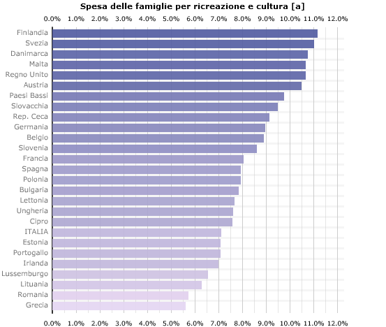 Ugualmente al di sotto della media europea è l’investimento pubblico in cultura (anche se è difficile ottenere dati precisi), malgrado le promesse e le dichiarazioni di molti politici. I dati Eurostat 2014 dicono che l’Italia è all’ultimo posto in Ue per percentuale di spesa pubblica destinata all’istruzione (7,9% nel 2014 a fronte del 10,2% medio Ue) e al penultimo posto (fa peggio solo la Grecia) per quella destinata alla cultura (1,4% a fronte del 2,1% medio Ue). Se si guarda alla percentuale sul Pil, la spesa italiana per l’educazione è al 4,1% a fronte del 4,9% medio Ue: siamo penultimi dopo la Romania (3%), insieme a Spagna, Bulgaria e Slovacchia. Non va meglio per la spesa per la cultura: 0,7% contro l’1% della media Ue. Peggio fa solo la Grecia con lo 0,6%. Per la protezione sociale l’Italia spende il 21,5% del Pil (19,5% la media Ue), ai primi posti dopo Finlandia, Francia, Danimarca e Austria. L’altro dato inquietante è che negli ultimi anni la spesa per la cultura, sia pubblica sia privata, è diminuita, anche per effetto della crisi economica, con un leggero rimbalzo in alcuni settori negli ultimi anni.
