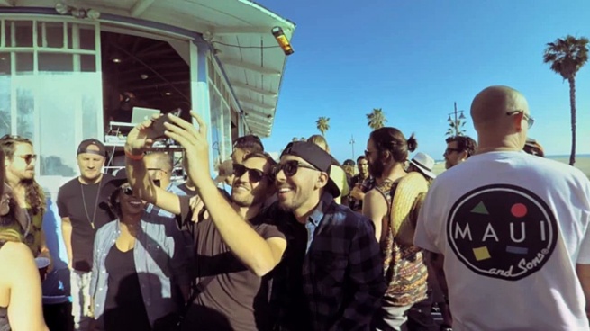 La festa sulla spiaggia a Venice Beach: Shinoda fa un selfie con Lorenzo Errico, manager dei Linkin Park, che interpreta un cameo nel video