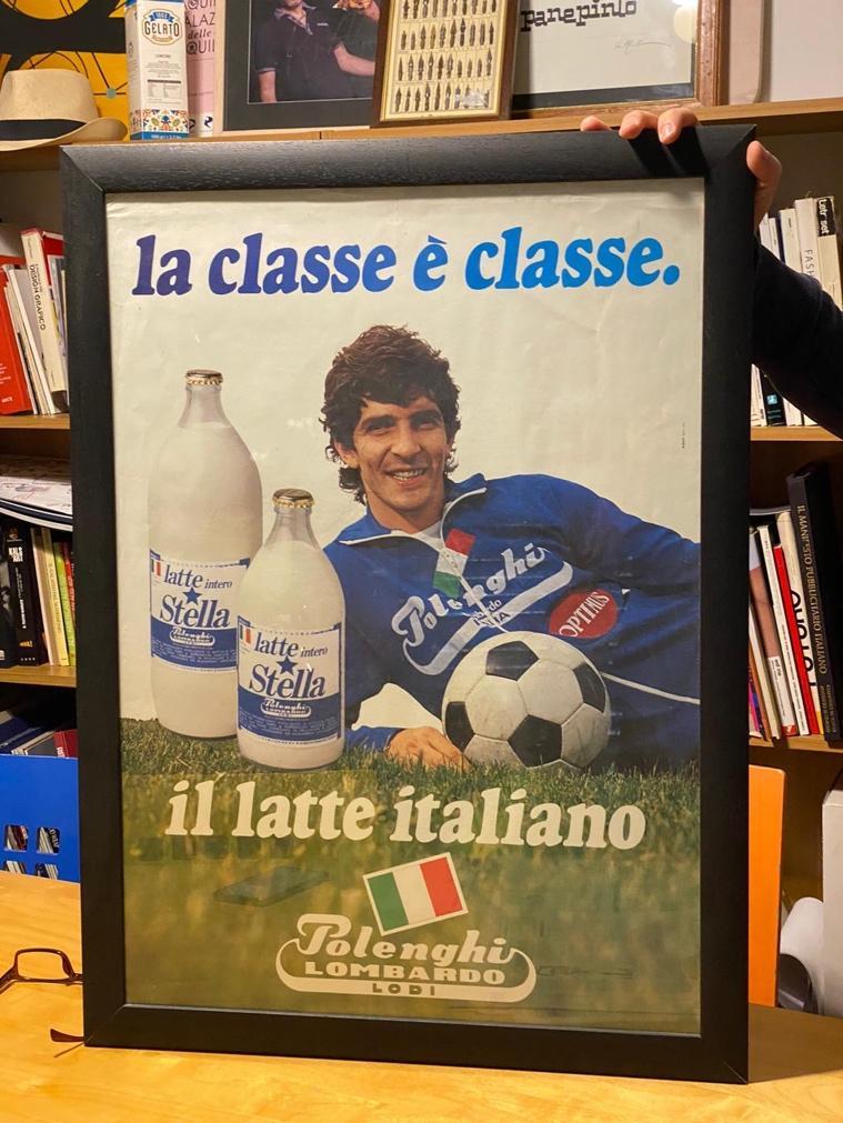 Ma in questa immagine che gironzola per i social, probabilmente, colpisce di più un’altra cosa. Qui non siamo di fronte, infatti, a un annuncio pubblicitario ma a una sua messa in cornice. Cosa che sposta di molto i termini del problema. È come se ci fosse un ulteriore grado di glorificazione: non solo del calciatore, né solo del latte, e nemmeno della loro reciproca solidarietà, ma, molto semplicemente, dell’annuncio in quanto tale. È lui il soggetto reale della nostra immagine, quel quadro adesso esposto di fronte all’obiettivo fotografico grazie a quella mano che, compiacendosene, lo sorregge, con la buona compagnia di tutti quegli oggetti da studio pubblicitario là intorno (i pennini, le cartelline nel raccoglitore, il manuale del grafico sullo scaffale, ma anche gli occhiali, il panama, il tetrapack…). Sta qui, possiamo dedurne, il portato semiotico di Paolo Rossi, nel saper rapportare con calcolata modestia, anche al momento della sua tragica dipartita, la propria abilità calcistica con quella di un bravo esponente del mondo pubblicitario d’antan. Che sapeva di aver vinto anche lui la sua partita, andando a suo modo in rete con un annuncio ben fatto che, rivisto oggi in cornice, suscita parecchia nostalgia. La solita maledetta nostalgia, oppio dei popoli.