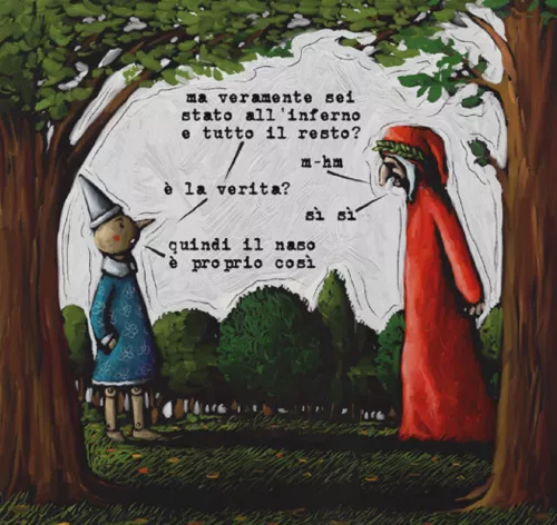 Dal post-Risorgimento al Ventennio, dal boom alla commercializzazione e airbnbizzazione di centri storici a cui occorrono testimonial d’eccezione (e se hanno già parlato inglese tanto meglio), Dante e Pinocchio attraversano temperie di pensiero e Italie differenti. A ogni nuovo decennio ce li ritroviamo davanti a supporto di questa o quella idea nazionale, come italiani sempre “da fare”. E dunque non si capisce bene, dantedì dopo dantedì, se a essere in balìa si sia noi oppure loro, che il carattere degli italiani quello è, e gli stranieri lo sanno o credono di saperlo (ma via che gli si può vendere anche quello), però Dante e Pinocchio cambiano di volta in volta aspetto, perché, icone, tocca loro significare quel processo continuo, ma che si immagina sempre finito, che Benedict Anderson chiamava la “creazione di una comunità immaginata”, in questo caso la nostra. I due nasi sono quindi quello che siamo stati o, meglio, quello che di volta in volta abbiamo, nel bene come nel male, creduto di essere; una “mitologia nazionale”, come scrive Jossa, che si esprime nell’idea di una Kultur (perché espressione geografica sarete voi!) che sia, nell’800 hegeliano, il fondo comune di un nostro essere popolo, fondo che, fallimento dopo fallimento, un Guicciardini per ogni Machiavelli (“rifà la base, il pensiero il metodo e pone il fondamento di un altro edificio”, De Sanctis), preparava l’Unità e subito dopo l’educazione necessaria – no way!, Lucignolo has to die – a essere all’altezza di quell’Unità.