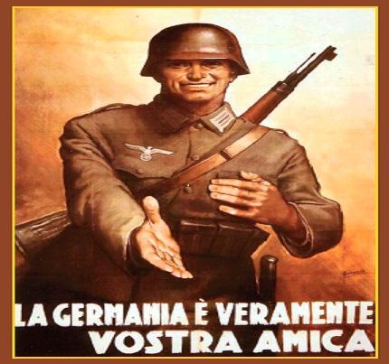 Che cosa è propaganda, oggi e in democrazia? Gino Boccasile, cartellonista ma anche ufficiale delle SS, fu l'autore di un esemplare manifesto durante la Repubblica di Salò. Gli si chiedeva di mettere in buona luce i nazisti presso la popolazione civile. Nacque il nazi sorridente, con la mano tesa e un titolo che recitava "La Germania è veramente vostra amica". Nell'Italia di quei giorni, tra rastrellamenti e fucilazioni, si può immaginare anche un solo passante disposto a farsi convincere da quella sinistra apparizione?