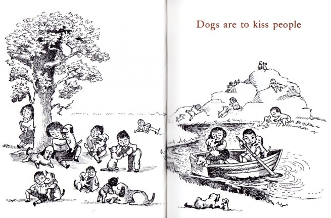 Il medesimo senso dell'umorismo della famiglia Travers, lo si ritrova intatto nei libri, meravigliosi, di Ruth Krauss e Maurice Sendak. Qui da noi non sono conosciuti, perché Maurice Sendak si legge esclusivamente per quello che forse è il picture book più noto al mondo: Nel paese dei mostri selvaggi (Where the Wild Things Are, 1963) edito in Italia da Babalibri. Oltre a questo titolo in libreria c'è poco altro: solo Orsetto (Little Bear, 1957), edito da Adelphi. Qualche anno fa era disponibile anche Luca la luna e il latte (In the Night Kitchen, 1970), sempre Babalibri. Sendak, invece, di libri ne ha scritti e illustrati a decine. E allora? Allora la realtà è che è sempre stato un autore per l'infanzia controverso. Non solo, per esempio, i suoi mostri selvaggi furono al centro di una serie di polemiche, quando uscirono, ma Luca, la luna e il latte appare tuttora nella lista dei libri contestati o banditi dalla American Library Association (ed è al ventunesimo posto nella lista dei “100 libri più contestati degli anni Novanta”). Non dimentichiamo che quando si parla di bambini e di educazione gli adulti possono diventare stranamente retrogradi, per non dire fascisti, come dimostrano le recenti polemiche su quella che è definita l'educazione di genere.