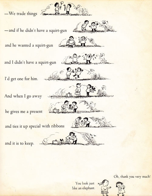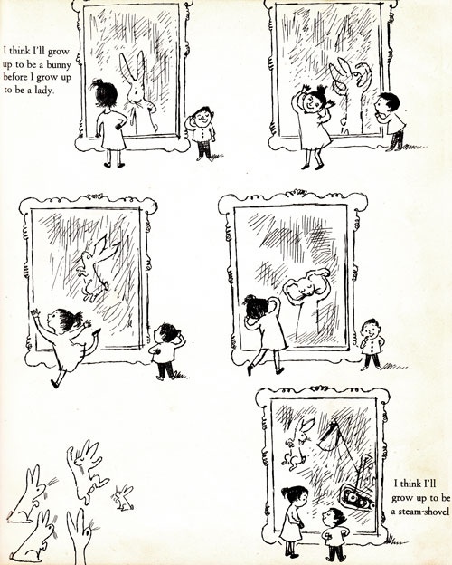 A Hole is to Dig (1952), A Very Special House (1953), I'll Be You and You Be Me (1954), e Open House for Butterflies (1960), i libri di cui qui trovate le immagini, parlano esattamente di questo. Quello strano e democraticissimo fatto che è l'essere bambini. Una condizione esistenziale che ti spinge con urgenza a costruire un nido e a deporre uova all'ora di cena, sapendo che è utile, vero, inutile e immaginario nello stesso momento, senza che questo rappresenti un problema.