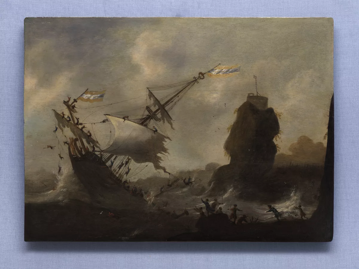 A spiegarcelo è un dipinto del primo Settecento giusto nella prima sala di Attraverso i diluvi, una scena di naufragio che appartiene a un genere – piccole e grandi navi sul mare calmo o in tempesta – molto amato già nel secolo precedente. Le vele sono ormai lacerate nonostante alcuni marinai, arrampicati sull’alberatura, stiano cercando di riavvolgerle; è tanto lo sforzo che il pittore ha voluto colorare di rosso (me lo fa notare Luca Santiago Mora) i pur microscopici occhi di un marinaio seduto sul pennone.