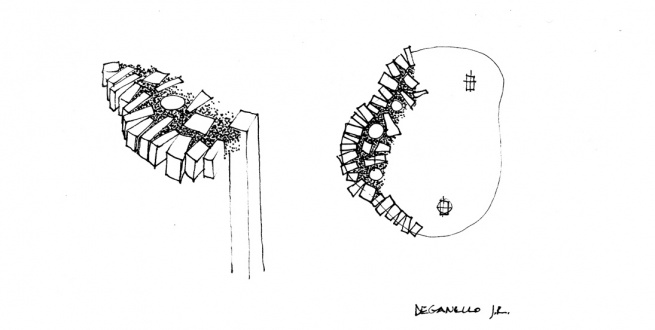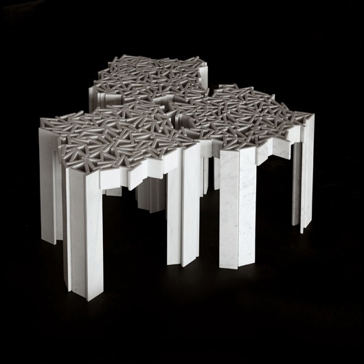 È la logica della massa granulata, che riempie le teglie o che piuttosto si stende sul piano in torroni e croccanti, a generare superfici illimitatamente estese (Ulian, Contin). E il problema del progetto sarà quello dell’orlatura (Deganello jr.), che ne limiti e contenga dunque la generazione infinita: problema di come limitare o ritagliare l’oggetto-piano ponendo un orlo alla smania dell’esteso, per restituirgli una dimensione usabile e utile, e riportare l’aggregazione dei clasti a una funzione plausibile. Se la graniglia spande sui pavimenti veneziani il proprio regno calpestabile, tavoli e tavolini da caffè hanno bisogno di spazi misurati e di gambe che possono soccorrere come elementi aggiunti, eterocliti anch’essi, ovvero crescere dalla medesima logica combinatoria che ne informa la superficie – innestate, integrate perfettamente, sono le stesse lastre o profili: solo tagliati un po’ più lunghi della media dei moduli che norma lo spessore del piano.