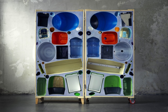 Più vicini alla segreta cucina dell’avanzo, cui qui si accenna, stanno i Fossili moderni di Massimiliano Adami, diventati icone di un’epoca che, sulla soglia del millennio, si è accorta dei continenti di plastica galleggianti al largo dell’Australia ma non ha smesso di fabbricare i suoi paesaggi ibridi, con i colori e le lucentezze polimeriche di indigeribili vuoti a non rendere. Inglobate nella schiuma rigida di poliuretano, le plastiche dei contenitori destinati al riciclo esibiscono le cavità interne, messe a nudo dal taglio finale: nei mobili di Adami si offrono come vani, nicchie disponibili, aperte soprattutto alla memoria della loro origine non troppo lontana, e alla riflessione di chi ne fa esperienza.