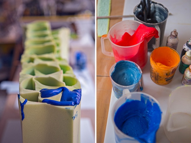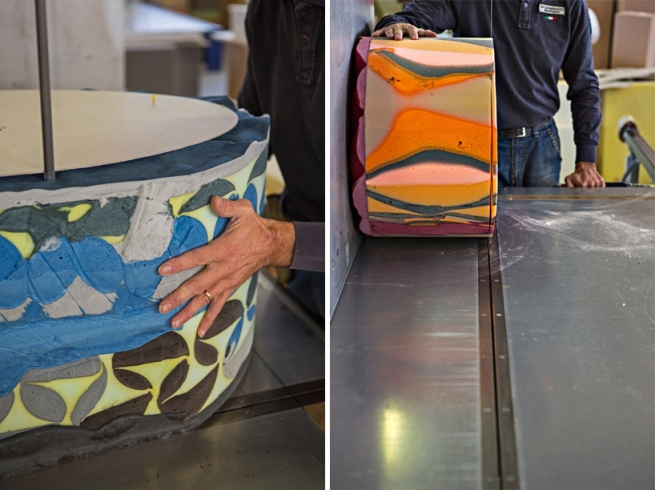 Ma se, di là del rifiuto domestico, è la massa degli sfridi delle lavorazioni seriali che preme e fa problema – problema di volume, di quantità – allora bisogna imparare dalle cave, che sulla fine dell’Ottocento l’hanno risolto con l’invenzione delle marmette di graniglia: con l’amalgama di tocchelli pregiati annegati in densi pastoni, tenuti insieme dalle proprietà leganti dei cementi colorati. Al modo cioè in cui si addensano timballi e torte della nonna, con latte uova e farina, e si mettono in forma dentro teglie o stampi, prima di cuocerli, farli a fette e servire. È l’idea antica di un assemblaggio delegato alla virtù collosa delle resine che tenacemente aggregano frantumi, nell’operazione di una formatura che segue la matrice cava, in negativo: che la riempie, la approssima rifacendone il pieno, accomodandovi i materiali composti, ridisponendo i pezzi sparsi, colando liquidità nello stampo. Così nascono i lavori più recenti, in cui Adami usa la gommapiuma di imballaggio e di risulta dalle lavorazioni degli imbottiti, disponendo le pezze per stratificazioni accurate e poi saldandole in masse compatte, su cui operare sezioni decise, secondo piani di taglio che svelano la ricchezza imprevedibile di una geologia leggera eppure stabile, solo illusoriamente precaria – una grafia di segni serpentini, colori e colature di resine leganti esibite come elementi di decoro (alta pasticceria).