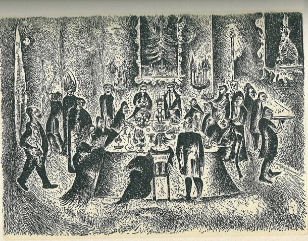 Ma cosa colpisce Haz del mondo di Dickens? L’umorismo, dice in prima battuta; quello nero, aggiungeremmo, poiché il nostro incisore spesseggia nella conversazione sul tema macabro. E cita la magione di Mrs. Havisham, quel castello che la contiene in abito di nozze mai compiute, bloccata nel tempo come certe signorine di Washington Square di James. Oppure la stanzona ovattata dove giace Mr. Jarndyce, colpito al cuore dalle rivelazioni sulla moglie. Mirando Haz appare sensibile alla “duplicità” dei personaggi di Dickens, alle famiglie tremende ed alle ipocrisie sociali. Quelle che si esplicano nei grandi banchetti, così spettralmente resi nelle sue incisioni, che, dice, sono delle vere e proprie nature morte. Pensa alle argenterie dei semiricchi, perché gli oggetti sono fondamentali in Dickens, dice, e cita a memoria “una donna interamente metallica”, riferito alla sua borsetta azzannante, a un personaggio “fine come un coltello”. Le persone cosificate nelle convenzioni, specie dei banchetti; ecco perché Dickens, dice, è un autore così cinematografico, per queste scene. Addirittura da cartone animato, aggiunge.