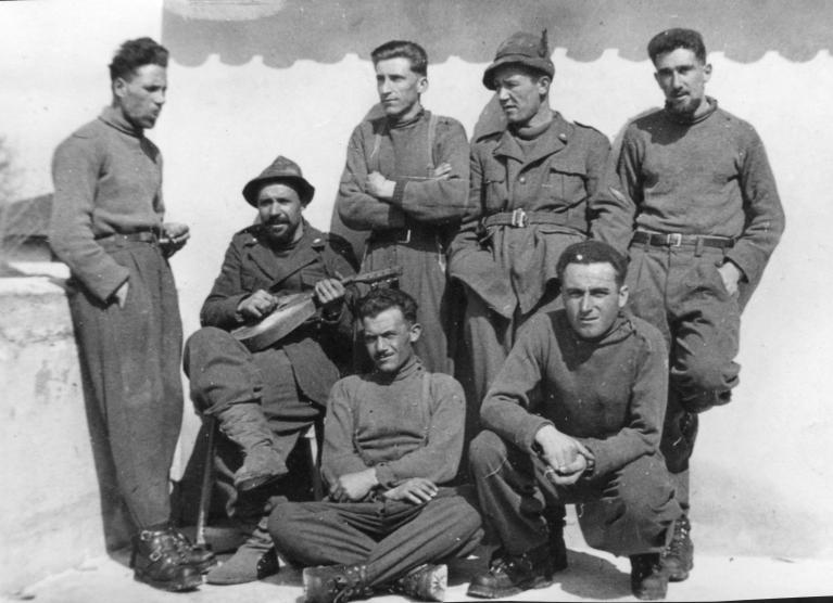 Rykovo febbraio 1942 con altri sergenti del battaglione Cervino, Rigoni è in piedi, l'ultimo sulla destra, archivio di famiglia Mario Rigoni Stern.