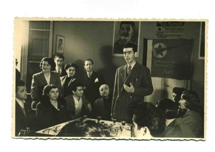 Siamo nei primi anni Cinquanta e la scena si svolge a Forlì, nella sede locale del PCI. Alla parete la bandiera rossa della FGCI, un grande ritratto di Stalin, una locandina de “La fiaccola”; accanto alla finestra, una fotografia incorniciata, con un uomo in piedi davanti a un portone. Il conferenziere, in piedi, ha valutato bene la presenza del fotografo, come anche gli uditori: ha calibrato attentamente il movimento del braccio sinistro, insomma si è messo in posa da oratore (lo conferma la innaturale rigidità dell’atto). Anche il doppiopetto, con la penna che spunta dal taschino, parla di una preparazione meticolosa.