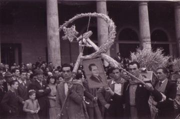 Qualche anno prima, nel 1947, e più a Ovest: l’inaugurazione della Festa Provinciale dell’Unità a Reggio Emilia. È una vera e propria sfilata che, si direbbe, comincia davanti all’ex convento di San Francesco, passa davanti al teatro Municipale e si conclude in piazza della Vittoria. Il fotografo ha fatto tre scatti a terra, davanti al portico del teatro e uno dall’alto, da quella struttura in legno che si vede in una delle foto e che forse serviva come palco degli oratori. Nel primo scatto si vedono diverse decine di persone in piedi sulla scalinata che osservano uno dei momenti centrali del corteo: due giovani in giacca e con fazzoletto rosso al collo che reggono una falce e martello realizzata con spighe di grano, da cui pende un ritratto di Palmiro Togliatti. Dietro, con altri ragazzi in giacca e fazzoletto rosso, ci sono dei grandi mazzi di grano a cui sono legati dei ritratti; il primo è coperto, ma il secondo è chiaramente quello di Stalin, entro cornice.