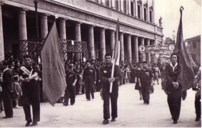 La sfilata non si ferma: alcuni operai e operaie in tuta avanzano lentamente, preceduti da tre portabandiera; ai lati due grandi bandiere rosse, al centro sembrerebbe un tricolore. Più indietro, si scorgono degli elaborati striscioni con scritte e ritratti entro tondi; sul primo si legge: “L’Unità giornale del popolo”. Un tricolore è ben visibile in un altro momento della sfilata, quello dei contadini: tre file parallele di biciclette vengono condotte a mano, le donne davanti, gli uomini dietro.