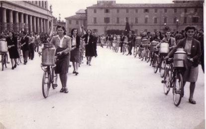 Tutti hanno sistemato il bidone del latte: gli uomini su un’assicella di legno fissata alla canna, le donne su un supporto davanti al manubrio; i bidoni (ben più piccoli di quelli portati dagli uomini) sono ingentiliti da nastri, rossi è facile immaginare.