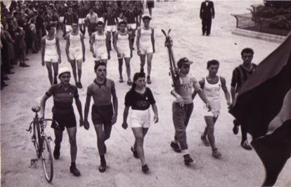 L’ultima foto parla di sport: aprono la strada cinque ragazzi e una ragazza, tutti con lo stesso passo (tranne il ragazzo con la bici a mano); quattro hanno magliette su cui si legge la scritta “Ospizio”, uno dei quartieri alla periferia orientale della città. Vogliono evidentemente rappresentare attività sportive diverse: il ciclismo, l’atletica, lo sci (il ragazzo è addirittura vestito con abiti invernali), il calcio. Cinque metri più indietro ecco che arriva, in calzoncini e magliette bianche, una squadra di atletica e, più lontano, una squadra di calciatori in magliette a strisce nere (e rosse?). Una delle cose che più colpisce in quest’ultima foto – ma si ritrova anche nelle altre, salvo pochissime eccezioni – è l’assenza di sorrisi: procedono con facce serie, in un avanzare che ha ben poco di giocoso.