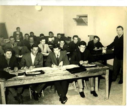Che cosa stanno facendo in questo preciso momento? I giovani del primo banco hanno accanto a loro le cartelle scure a bustina per i libri e tengono in mano delle squadre di plastica e delle matite: era un disegno, un grafico o uno schema? È notevole che si tratti di un corso esclusivamente maschile. Del resto sono testimoniati, sempre negli anni Cinquanta, corsi destinati unicamente alle donne, come quello di una foto modenese.