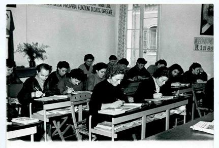 Facce perlopiù serie anche in una foto che ritrae una scuola di partito nella Forlì degli anni Cinquanta; quasi tutti in giacca e cravatta, alcuni con libri in mano o sui banchi.