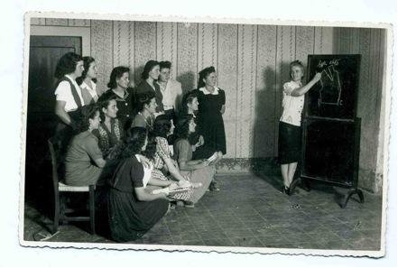 Molto più rilassato – d’altronde la situazione è completamente diversa – il gruppo femminile che assiste a una lezione di cucito organizzata dal partito a Carpi; dal tipo di acconciature – molto ben curate ancora come del resto gli abiti – si direbbe che siamo ancora entro gli anni Quaranta. Sorride l’insegnante indicando il disegno alla lavagna, sorridono diverse ragazze mentre mantengono la loro concentrazione, fingendo di non accorgersi della presenza del fotografo.