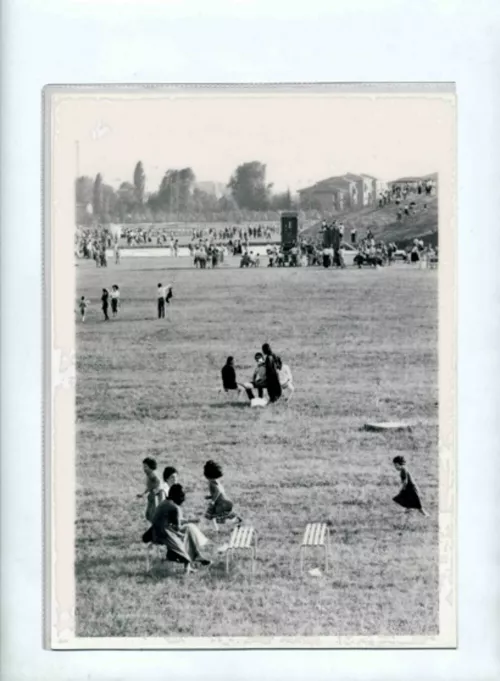 Una foto scattata sempre a Modena pochi anni dopo – all’inizio degli anni “del riflusso” come si disse – mostra l’allentarsi di quell’ordine compatto che – in forme e gradi diversi – percorre tutte le fotografie appena osservate. È pomeriggio; alcune panchine in mezzo al prato, persone sedute e bambini che si rincorrono; due coppie di giovani mangiano qualcosa su una panchina; più in là un signore lancia qualcosa a un cane; in fondo al prato, gruppi sparsi di persone sedute e in piedi stanno aspettando qualcosa, forse il comizio finale.