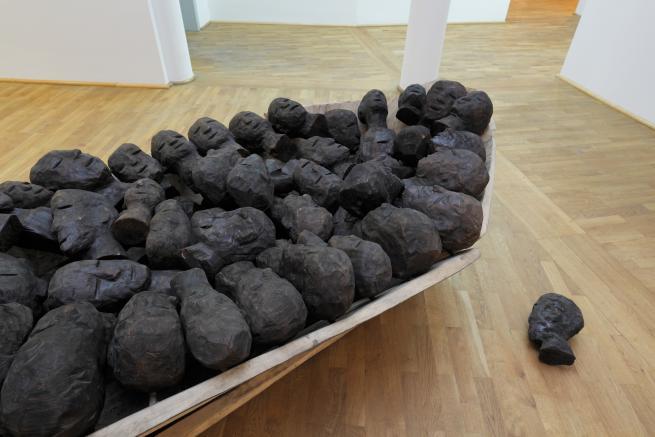 S.N. : Toutes les œuvres représentent un élément de ce que j’ai voulu dire. C’est la raison pour laquelle je les ai rassemblées. Mais pour le plaisir de la discussion, je vais en décrire une. Il s’agit d’une barque pleine de têtes en bois, noires. Je l’ai placée en enfer. Cette pièce de Jems Kokobi fait partie des rares œuvres qui n’ont pas été spécifiquement produites pour l’exposition. Lorsque Jems a réalisé cet ensemble, il ne pensait pas à Dante, bien entendu. Le but qu’il s’était donné était une dénonciation de l’esclavage. Mais lorsque j’ai commencé à penser à l’exposition, cette œuvre m’est immédiatement revenue en mémoire. Pour moi, c’était la barque de Caron et elle ne flottait pas sur l’Océan Atlantique la cale pleine de « bois d’ébène », mais faisait traverser le Styx aux âmes damnées.