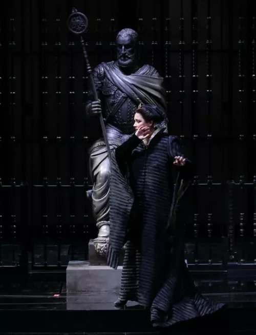Ma soprattutto, questo titolo è una presenza che si può ormai definire costante nella programmazione: la Scala lo ha proposto anche nel 2013 e nel 2017, e negli ultimi tempi se ne sono avute edizioni ragguardevoli alla Fenice di Venezia (2019, regia di Robert Carsen, direttore Myung-Whun Chung), a Firenze e a Napoli. Nello scorso novembre è andato in scena in quattro teatri di tradizione importanti come quelli di Reggio Emilia, Modena, Piacenza e Rimini. Fra l’altro il protagonista principale di quegli spettacoli, il basso Michele Pertusi (impegnato nella formidabile parte di Filippo II), è stato ingaggiato a venti giorni dalla prima milanese per sostituire nella sala del Piermarini il cantante fino a quel momento designato. E non basta: negli stessi giorni dell’inaugurazione scaligera, un allestimento di OperaLombardia girerà fra Brescia e Como, dopo essere andato in scena a novembre anche a Pavia e a Cremona. Come dire, quasi un’inflazione.
