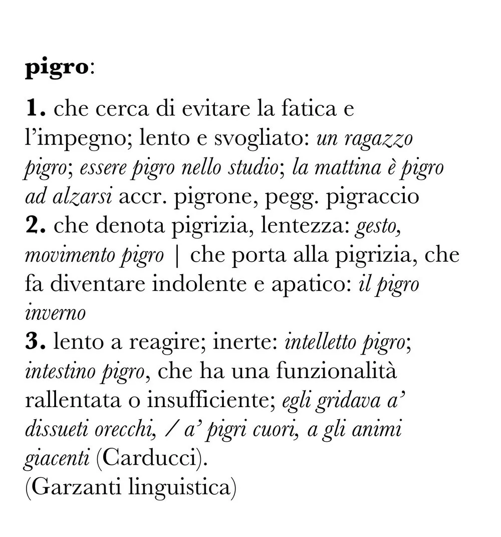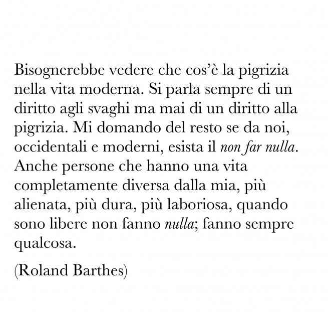 Sembriamo ormai capaci soltanto di quella pigrizia che Roland Barthes definisce «imbronciata», carica cioè di tutto il senso di colpa di cui è permeato il nostro vivere. Vogliamo essere competitivi e al passo con il correre del mondo. Ma dove stiamo andando? Siamo ancora capaci di sostare senza percepire la sosta come una resa? Cosa abbiamo perso dopo aver abbandonato il piacere della dissipazione, del tempo e forse non soltanto di quello? Partendo da Roland Barthes, che ci descrive la delizia della pigrizia, e attraverso le parole di Peter Handke e le riflessioni che il filosofo sudcoreano Byung-Chul Han dedica al tema della stanchezza, proviamo a ragionare su questi temi nella società contemporanea: il tempo e la pigrizia, l’indugio e la stanchezza, l’accelerazione, l’ozio, lo spreco, e il senso di un tempo senza finalità alcuna.