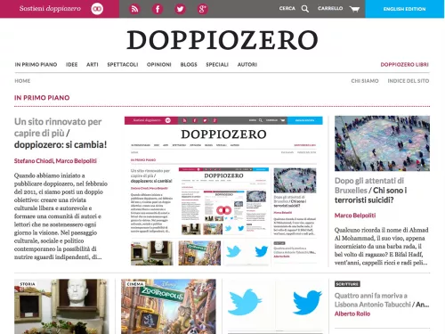 doppiozero si rinnova e lancia oggi un sito integralmente ridisegnato, a partire dal nuovo progetto grafico pensato per la massima leggibilità su computer, tablet e smartphone. La realizzazione del progetto è stata resa possibile dal successo della campagna di crowdfunding #abbiculturadite che tra giugno e luglio dello scorso anno ha visto contribuire centinaia di lettori chiamati a sostenere doppiozero e il suo modello di produzione culturale condivisa.
