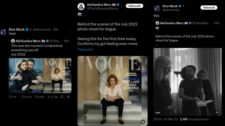Già, perché la lotta tra mondanità e marzialità si gioca anche su un altro fronte, quello mediatico. Nel luglio 2022, Annie Leibovitz ritrae per Vogue America Olena e Volodymyr Zelensky in Ucraina. Un photoshoot divisivo che all'epoca infiamma l'opinione pubblica, accusando la coppia di due peccati capitali: glamourizzare la guerra con abiti e accessori eleganti (di brand ucraini) e veicolare un’immagine patriarcale, con Volodymyr in posa protettiva-dominante sulla fiduciosa Olena. Patriarcato o protezione? La retorica della guerra su Vogue, in ogni caso, sensibilizza persone al di fuori dei circuiti informativi tradizionali, giustificando il mezzo con il fine. Vogue, con la sua estetica granitica, trova una mediazione tra moda e cronaca di guerra, contribuendo anche a promuovere il made in Ukraine. La questione si esaurisce a ridosso dell’uscita della rivista, inghiottita dalla fame di nuovi scandali. Perché allora Musk la riesuma su X a febbraio 2025, quasi tre anni dopo?