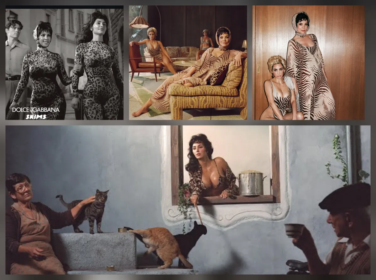 Mi riferisco agli immaginari simmetrici evocati dalle campagne promozionali delle collaborazioni tra il brand di intimo e leisurewear di Kim Kardashian – Skims, quindicesimo hottest brand al mondo per Lyst – e due case di moda italiane: Dolce & Gabbana (novembre 2024) e Roberto Cavalli (giugno 2025, sotto la direzione creativa di Fausto Puglisi).
