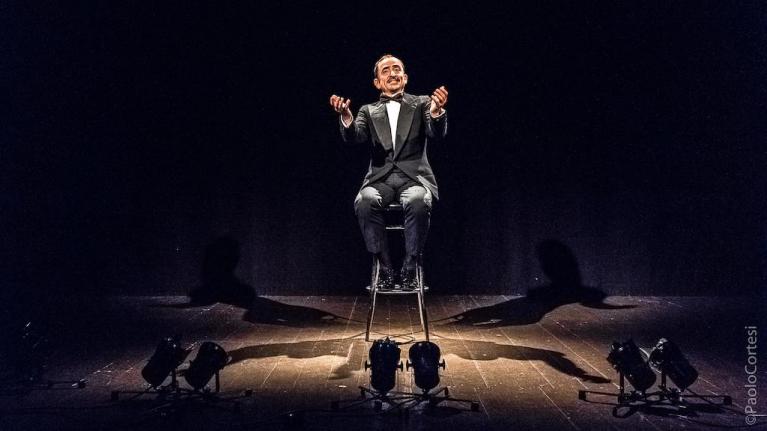 Cardillo con questa materia ci gioca consapevolmente: dopo il primo bombardamento di pezzi brevi, brevissimi, una riga, due, tre al massimo, al fulmicotone comico, si blocca e chiede agli spettatori: “Ma è tutto così, lo spettacolo? Sì, è tutto così”. Aggiungete che lui, in vestito nero e cravattino, è immobilizzato su uno sgabello, seduto prima, poi più sbracato, quindi disteso come in sonno, in equilibrio precario sempre sullo sgabello come in un sogno, come in una gabbia di parole e barzellette, inchiodato a tenere la nostra attenzione per piccoli scarti, per cambi di tono, per tempi comici (sublimi). Marchesi, come le sue parole, diventa una prigione, quella che siamo stati, quella che ci portiamo ancora dentro, e una nostalgia, come tutte le nostalgie velenosa, ma desiderata, “un flusso di incoscienza” come scrive l’attore nelle note di sala. In quel divertimento rivela una costrizione, una coazione, una sofferenza che diventano anche nostre, simile al nostro esilio in una lingua che ci parla, in un sistema di cose e di consuetudini che ci agitano, ci sognano, ci divorano, mentre sembrano farci svagare.